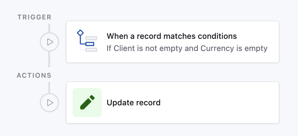 • Currency ← Currency (from Client) ▶ NamePaste this into the AI Assist prompt inside Automations; Airtable will scaffold the trigger and update step for you.